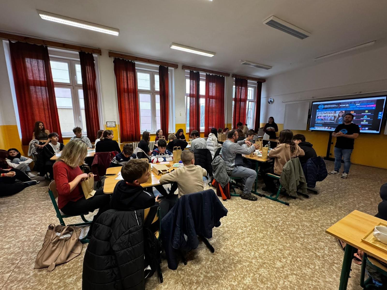Atmosféra byla po celý den výjimečná — chodby zaplnily týmy v soustředěných debatách nad úkoly, o patro dál bylo slyšet nadšené výkřiky z povedených pokusů a na jiných stanovištích se rodily malé příběhy fair play a spolupráce.